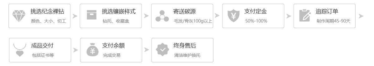 这个神奇的蜕变之路大概是这样的:先将动物和人的毛发和牙齿进行火化,把碳从中分离出来,为了提高碳的纯度,会给它蒸个桑拿,加热!由此碳氧化物会被分解,金属杂质就跟你的汗水一样蒸发掉了,从而产生稳定的石墨结构。出了桑拿房之后,可以获得纯度为约为99%的石墨,接下来,再把石墨放进特殊的生长室中, 模拟真实的自然条件,创造出一个高压、高温的隔离环境,石墨在里面睡上一觉,就会变身成金刚石。睡醒的金刚石穿着一套熔融金属睡衣,小心翼翼的脱掉这层睡衣并且清洁之后,可以看到一颗粗糙的金刚石,最后只要再给金刚石化个妆,进行精细的打磨和抛光,整个制作过程就完成了,嗯……就是这么粗暴。有句话,“爱你已深入骨髓”,大概也不过如此吧,将自己的所爱永远留在自己身边,这种方法也被称为“钻石葬”,钻石本身就是宝石之王,把钻石随身携带 纪念和美丽两不误也是极好的。